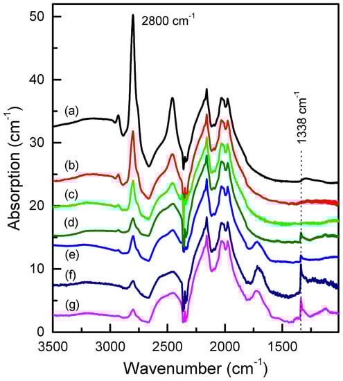Typical infrared absorption spectra recorded for diamond crystals produced in the Mg-Si-C system with different Si content. (a,b) 1; (c) 5; (d,e) 20; and (f,g) 50 wt % Si. The spectra are displaced vertically for clarity.