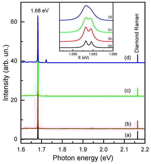 Diamond crystals grown from the compositions with higher Si contents showed changes in the PL spectra (Figure 11). Although the intensity of the 1.68 eV peak did not change significantly, it became broader so that its doublet structure could not be observed. This broadening suggests that the diamonds produced in the Mg-Si-C system with Si content ≥10 wt % have a higher level of internal strains. One possible source of these strains could be substitutional silicon defects, which also give rise to the strain-induced vibrational mode at 1338 cm−1. Another distinct feature evident from Figure 11 is that a peak at 1.722 eV, which was very weak for diamonds from the low Si content systems, became prominent in the PL spectra and attained intensities comparable to that of the 1.68 eV peak. The occurrence of the 1.722 eV peak in the spectra of diamonds grown from the Mg-Si-C system was noted previously [12]. Here, we confirm that it appears in the PL spectra of Si-doped HPHT diamonds. The nature of the defect responsible for the 1.722 eV is not clear at the moment and deserves further investigation. Nevertheless, we suppose it is very reasonable to assign this center to a defect related to silicon impurities.