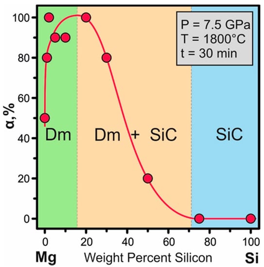 The results of this study allow us to assess the effect of the Mg/Si ratio on the crystallization of diamond and accompanying phases in the Mg-Si-C system at fixed P-T-t conditions. Figure 12 shows the degree of the graphite-to-diamond conversion (α) as a function of the silicon content in the Mg-Si-C system. It follows that the addition of even small amounts, about 1 wt %, of silicon results in a substantial increase in the conversion degree. With further increases in Si content in the range of 2 to 20 wt %, α increases to as high as 90−100%. As it was suggested previously [12], the most probable reason for increasing values of α in this range of compositions can be related to increasing carbon solubility in the binary melt of two carbide forming elements, Mg and Si. The observed sharp decrease in α for the Mg50Si50 starting composition is associated with the formation of two melts with different compositions. The first, magnesium-rich, melt ensures diamond synthesis, while the second, silicon-rich, melt does not exhibit this ability. Because of this catalyst melt partition, the amount of the diamond-forming melt in this experiment is substantially less than in other experiments with lower Si content in the system. In the case of the Mg25Si75 initial composition, there is a single melt, which is substantially enriched in Si and does not show the catalytic ability for converting graphite to diamond. It should be noted that no carbon or carbon-containing phases were detected in samples of the quenched melt. Furthermore, carbon was not detected as an impurity in all quenched phases. This can be explained by the low carbon solubility in the silicon-rich melt and the formation of silicon carbide at the graphite-melt interface, which blocks further interaction between the graphite and the melt. A similar situation takes place in the Si-C system. It should also be noted that the formation of silicon carbide occurred in all experiments with the Si content from 20 to 100 wt %. SiC was present as the cubic 3C modification in the majority of the experiments, while the hexagonal modification occurred only in the experiment with the Mg50Si50 starting composition and crystallized from the melt that did not produce diamond. As is known, preferential crystallization of cubic or hexagonal modifications of silicon carbide is affected by numerous factors, such as temperature, pressure, system composition and impurities [23,24]. The appearance of the 4H-SiC modification in this experiment is possibly related to the system composition, but clarification of this issue lies far beyond the scope of this work.