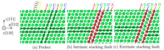 Atomic configurations of (a) a perfect lattice, (b) a lattice containing an ISF, and (c) a lattice containing an ESF. Colored by the adaptive common neighbor analysis (a-CNA) [17], green and red atoms have an FCC and hexagonal close-packed (HCP) local structures, respectively. Black lines illustrate boundaries of elements, within which there are no lattice defects. Different atomic planes that have the same configuration are labelled as A, B, and C, respectively. In (a,b), elements are employed immediately adjacent to each other; in (c), one layer of atoms on a plane is introduced between elements to accommodate the ESF, which involves three adjacent atomic layers.