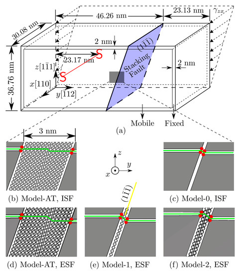 (a) An illustration of the simulation cell for interactions between a screw dislocation and an SF. An ISF is described using Model-AT and Model-0, as shown in (b,c), respectively. An ESF is described using Model-AT, Model-1, and Model-2, as shown in (d–f), respectively. The red and gray circles are nodes and atoms, respectively. The gray shades are rhombohedral elements. The green line is the dislocation migration pathway if the dislocation is transmitted across the SF.
