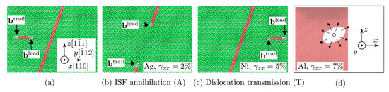 All materials exhibit annihilation of the ISF, while Ni and Ag also experience dislocation transmission across the ISF with an increasing applied shear strain, a common sequence for screw dislocation/ISF interactions [4,5]. Previous MD simulations [4] found that whether the ISF is annihilated or penetrated depends on a competition between the nucleation of the trailing partial dislocation along the ISF and the nucleation of the leading partial dislocation on the other side of the ISF. More specifically, the smaller the ratio of the stable SFE to the unstable SFE, the more likely the screw dislocation is transmitted across the ISF subject to the same applied shear strain. Among the three materials in the present work, this ratio is 0.34 for Ni, 0.87 for Al, and 0.16 for Ag [4,20,21]. As such, Ag requires the lowest minimum strain (3%) for dislocation transmission, and only the ISF annihilation is observed in Al with γzx up to 6%. Note that in Al, the ISF is annihilated even in the absence of an incoming lattice dislocation when γzx ≥ 7%; specifically, the restoration of the perfect lattice arrangement is initiated at a random location in the ISF and spreads out across the ISF, as marked by the open circle and arrows in Figure 4. This shear-induced ISF annihilation is not observed in Ni and Ag for γzx up to 10%.