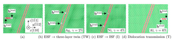 (iii) the full dislocation is transmitted across the ESF and glides on a plane that is lower than the incoming slip plane along the z direction. Then, the leading partial dislocation is nucleated from the ESF, followed by the nucleation of the trailing partial dislocation, as shown in Figure 5d. The re-dissociation of the full dislocation to the right side of the ESF follows reaction (1).