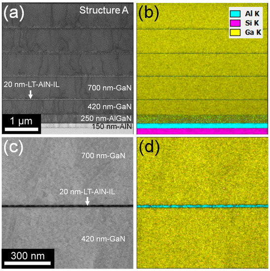 Figure 2b, the distribution of the Si, Al, and Ga elements measured by energy-dispersive X-ray (EDX) are represented by various colors for sequentially distinguishing among the Si substrate, the AlN buffer layer, the AlGaN transition layer, the GaN epilayers, and the LT AlN ILs. As shown in