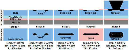 3 flow, a strip void emerges along the GaN [110] crystalline directions in stage C. In stage D, the HT AlN IL is grown on the etched GaN epilayer, however, this growth is discontinuous because of the strip void generation. Finally, in stage E, a 700-nm GaN epilayer is grown on the HT AlN IL. However, the strip void caused by GaN decomposition is too large to be flattened laterally; thus, a strip pit is produced on the surface of the 700-nm GaN epilayer.