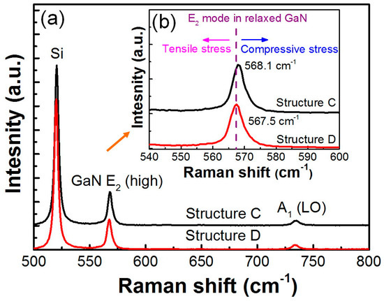 2 (high) peak of structure C shifted to higher frequency side than that of unstressed GaN, indicating a compressive stress of −0.116 GPa. For structure D, the E