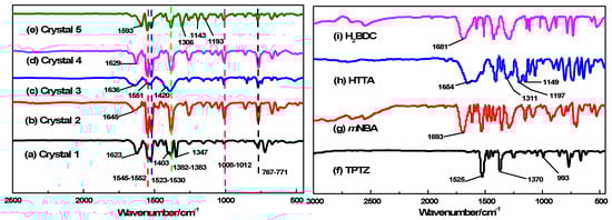 Infrared spectra of five crystal complexes and ligands: (a) {[Eu2(TPTZ)2(mNBA)6(H2O)2]·2CH3OH}n; (b) [Eu(TPTZ)(CF3COO)(H2O)5]·Cl2·CH3CH2OH; (c) {[Yb2(TPTZ)2(BDC)3]·2H2O}n; (d) [Yb(TPTZ)Cl(H2O)4]·Cl2; (e) [Er(TPTZ)(TTA)Cl2]; (f) TPTZ; (g) mNBA; (h) HTTA; (i) H2BDC.