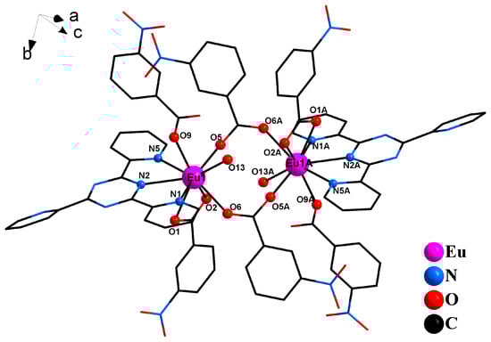 The lanthanide complexes have a great deal of applications in the fields such as single-molecule magnets, biomedicine, electro-luminescence devices, laser-systems and optical communications [1,2,3,4,5]. However, f-f electron transitions of lanthanide ions are forbidden by the parity rule. Thus, their fluorescent intensities and quantum efficiencies are relatively low [6]. Some neutral or anionic organic ligands, such as aromatic carboxylic acid, have been introduced. These organic ligands have excellent light absorption abilities and can transfer energy to lanthanide ions due to so-called “antenna effect” [7,8]. Because of the distinctive coordination modes and conjugated large π system, neutral ligand 2,4,6-tri(pyridin-2-yl)-1,3,5-triazine (TPTZ) has become one of the most attractive ligands. Moreover, TPTZ can increase the chemical and thermal stability of the complexes [9,10,11,12,13,14]. In addition, the triplet energy level of TPTZ (21,200 cm−1) matches the lowest excited state energy level of Eu3+ (17,200 cm−1), which results in the enhancement of the luminescence intensities of europium complexes [15,16]. Up to now, crystals of Sm, Eu, Tb, Dy, Gd, Nd, Cd, Cu and Co with TPTZ have been synthesized [17,18,19,20].