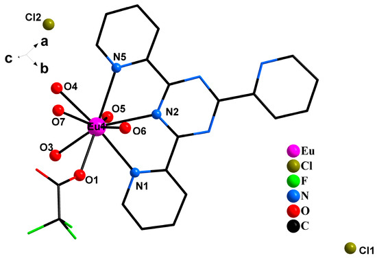 [Eu(TPTZ)(CF3COO)(H2O)5]·Cl2·CH3CH2OH (2). Crystal 2 is a europium compound and crystallizes in a monoclinic system, C2/c space group. Each asymmetric unit consists of one europium ion, one TPTZ ligand, one trifluoroacetate and five coordinated water molecules (Figure 3). Crystal 2 is a mononuclear. The coordination number of Eu Ш ion is 9. Eu Ш ion coordinately bonds to three nitrogen atoms from one TPTZ (N1, N2, N5), one oxygen atom from trifluoroacetate (O1) and five oxygen atoms from the coordinated water molecules (O3,O4, O5, O6, O7).