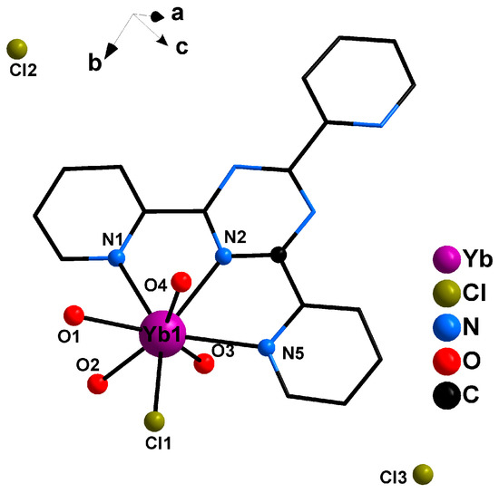 In Crystal complex 4, TPTZ coordinates with Yb ions through three nitrogen atoms of the center ring and the pyridyl ring, and the other nitrogen atoms could not coordinate with more Yb ions. However, one TPTZ may coordinate with two monovalent or bivalent transition metal ions [47,48,49]. This may be because, after coordination between TPTZ and Yb ions, trivalent Yb ions attract more electrons of TPTZ, resulting in lower electron density in other nitrogen atoms. The ligand of organic carboxylate tends to adopt mutiple coordination modes with Ln Ш and form multinuclear crystals. When the amount of organic ligands is sufficient in the preparation of the complexes, other solvent molecules have difficulty participating in coordination. Crystal complex 1 contains two coordinated water molecules and Crystal complex 3 has no coordinated water molecules. When the organic ligand is lacking, the solvent molecules participate in coordination with Ln Ш ions. Water molecules generally adopt oxygen atoms coordinated with lanthanide ions. In Crystal complex 2, there are five water molecules and, in Crystal complex 4, there are four water molecules and one chloride ion participating in coordination, respectively. If water molecules are lesser in number, the chlorine ions tend to participate in coordination with Ln Ш ions, which indicates that the coordination ability of water molecules is greater than chlorine ions. Because of the lack of organic ligands and water molecules, two chloride ions also participate in coordination in Crystal complex 5.