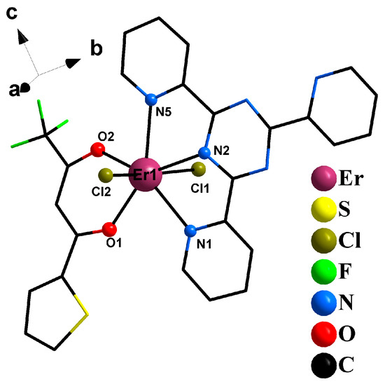 [Er(TPTZ)(TTA)Cl2] (5). Crystal 5 is an erbium complex and crystallizes in a monoclinic system, P21/n space group. The asymmetric unit of the compound contains one Er Ш ion, one TPTZ, one TTA and two chloride ions (Figure 6). The coordination sphere consists of three nitrogen atoms from one TPTZ, two carbonyl oxygen atoms from one TTA, and two chloride ions. The coordination number of erbium ion is 7, which is relatively lower than the other four crystals. This is ascribed to the deficiency of ligand and no coordination water.