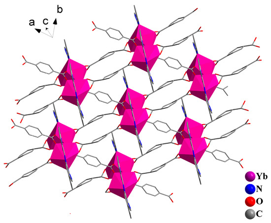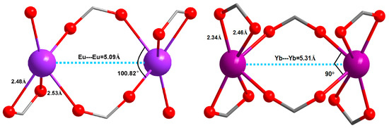 As presented in Table 2, Ln-Ln distances in Crystals 1 and 3 are shorter than the other three crystals, which suggest that the Ln-Ln distances in a bi-nuclear structure are shorter than those in a single-nuclear structure. The 2D network structure of Crystal 3 is visualized in Figure 7. As shown in Figure 8, the Eu-Eu distance is shorter than Yb-Yb distance, and the bond angles of O-Eu-O is larger than those of O-Yb-O, which may be related to the larger radius of an Eu ion (94.7 pm) than a Yb ion (86.8 pm) [46] as well as the different coordination modes of Ln Ш. Although the coordination number of the two Complexes 1 and 3 are all 9, in the europium complex, Eu ion coordinates with three carboxyls by one bidentate chelating, one monodentate and one bridging coordination. The steric hindrance of this coordination model is smaller than that in the ytterbium complex, in which a Yb ion coordinates with the carboxyl by two bidentate chelating and one bridging coordination. From Table 2, the bond lengths of M-O vary in different crystals. It can be concluded that the difference of bond lengths may be related to the coordination number and steric hindrance of lanthanide complexes. With increasing of the coordination number and the steric hindrance, the bond length of M-O gets longer. The bond lengths of M-O in bidentate chelating are longer when compared with monodentate and bridging coordination.