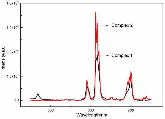 Emission and excitation peaks of Complexes 1 and 2 were measured in solid state under 0.1 nm slit widths at room temperature. The excitation spectra of the europium complexes were measured by monitoring the emission wavelength at 616 nm (Figure S8). The emission spectra were measured at room temperature under the optimal excitation wavelength at 318 nm for Complex 1 and 356 nm for Complex 2 within the scope of 450–750 nm (Figure 9). Both of the emission spectra of Complexes 1 and 2 show five typical emission bands corresponding to the 5D0→7F0, 1, 2, 3, 4 transitions of the Eu3+. The two spectra do not show a significant difference, suggesting that the light-emitting sites in Complex 1 are the same as those in Complex 2. Among the five emission bands, the electric dipole transition 5D0→7F2 around 616 nm is the strongest. In addition, the ratio of electric dipole transition and magnetic dipole transition (5D0→7F1) of Complexes 1 and 2 are 3.31 and 4.28, respectively, which indicates that the coordination environment of Eu3+ complexes are not center symmetric [50,51,52,53,54]. The luminescence intensities of electric dipole transition of Complexes 1 and 2 are 0.74 × 105 and 1.4 × 105, respectively. The emission intensity of Complex 2 is stronger than that of Complex 1. The energy difference between the triplet energy level of mNBA and Eu3+ excited state energy is approximately 8000 cm−1, which is too large for energy transfer. Therefore, mNBA cannot effectively sensitize luminescence emission of Eu3+ ion in Complex 1 [55]. Complex 2 has a strong emission intensity with shoulder peaks, which may be ascribed to the crystal field splitting and the asymmetric molecule structure [56].