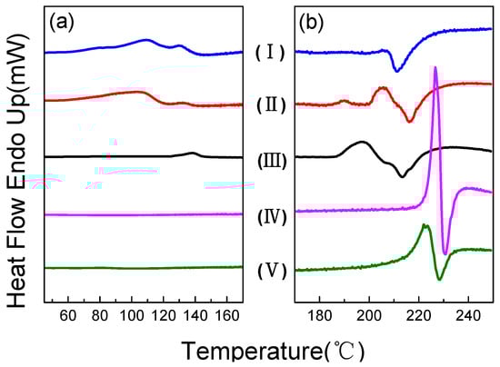 The DSC thermograms of the five crystal forms of VCV are presented in Figure 2. For Form I, II, and III—different crystal forms—as hydrates containing a certain of crystal water, there are significant endothermic peaks on their DSC scans because of water loss in the temperature range of 60–140 °C (Figure 2a). DSC curves of Form I and II showed two partially overlapping endothermic peaks at 70 and 130 °C respectively, which means there are two different types of crystal water in the crystal structure, whereas only one endothermic event at about 141 °C is seen for Form III. In addition, there are not any endothermic peaks in 60–140 °C on the runs of Form IV and Form V, which indicates that both of them are anhydrous compounds.