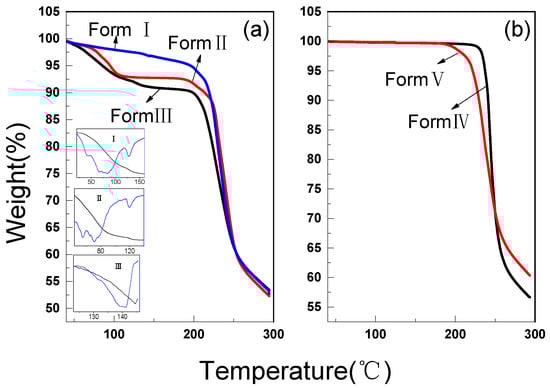 The water contents of all the forms were determined by TGA and the curves are illustrated in Figure 3. The three hydrates showed significant water release steps from Figure 3a, and Form I and II were respectively calculated to be 6.93 wt% and 4.78 wt% in the temperature range of 50–140 °C, but it is 2.42 wt% for Form III in a higher temperature range of 123–145 °C. The above results are respectively consistent with water content theoretically calculated from sesquihydrate, monohydrate, and hemihydrate. Whereas it is clear that Form IV and V had no any weight loss in the same temperature zone from Figure 3b, this suggest they are anhydrous crystal forms.