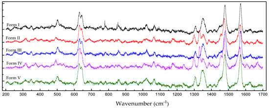 As well known, Raman spectroscopy is a reliable technology to differentiate crystal forms. From the Raman spectra of the five VCV crystal forms in Figure 4, the most distinctive region can be seen between 1250 and 1400 cm−1. In this region, Form I and V show three peaks, Form II and IV have four peaks, but Form III has only two peaks.