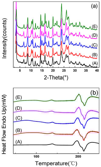 Figure 5. The PXRD patterns (a) and DSC curves (b) for Form III stored for 16 weeks, several specimens were taken out and tested at (A) 0 week, (B) 4 weeks, (C) 8 weeks, (D) 12 weeks, (E) 16 weeks.
