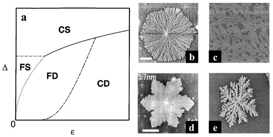 (a) Brener et al.’s morphology diagram for polymer crystallized in one-dimensional spatial confinement. In this diagram, ∆ in the y axis represents the degree of supercooling, and ε in the x axis represents the crystalline anisotropy. (b–e) Representative crystalline morphologies observed in polymer thin films: (b) Compact seaweed (CS); (c) Fractal seaweed (FS); (d) Compact dendrite (CD); (e) Fractal dendrite (FD) [37]. Copyright 2015. Reproduced with permission from Elsevier Ltd.