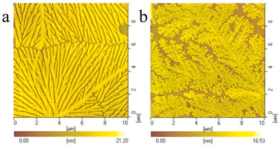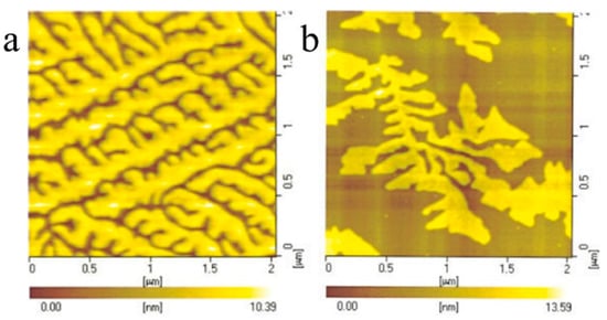 Qiao et al. [58] have examined the effects of Tc and molecular weight on the crystalline morphology of PCL thin film. Because Tc determines the degree of supercooling for polymer in crystallization, it strongly influences the crystalline morphology of polymer thin films, as illustrated in Figure 1a. Figure 4 shows the crystalline morphology of PCL thin film crystallized at different Tc’s. The PCL thin film formed a compact seaweed morphology at a lower Tc (i.e., a larger supercooling); while exhibiting fractal-like structure as the Tc increased to 42 °C. This coincided with the phase diagram shown in Figure 1a. The change of crystalline morphologies might be due to the alteration of crystallization kinetics under different degrees of supercooling [46,63]. Figure 5 shows the AFM images of PCL thin film having the same thickness, but different molecular weights. The PCL thin film with high molecular weight showed branches on one side of the stems; yet, that with lower molecular weight exhibited the branches on both sides of the stems. The reason was still unclear and required further study. A plausible explanation for this might be due to the high diffusion ability for the low-molecular-weight PCL.