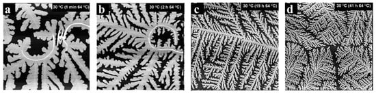 The presence of residual solvent also affects the crystalline morphology of PCL thin films. Mareau et al. [51] have investigated the influence of residual tetrahydrofuran (THF) on the crystallization process of PCL ultrathin films by real-time AFM. The morphology of PCL films crystallized at 30 °C depended strongly on the thermal history, as shown in Figure 6. The films were previously melted at 64 °C, slightly higher than the melting temperature (Tm) of PCL. A continuous decrease of the width of dendritic branches was observed as the melting period increased (Figure 6), because the increase of melting period decreased the amount of residual solvent in the spin-coated films. It was considered that the residual THF could act as a plasticizer, and the decrease of THF concentration resulted in the lower mobility of PCL chains.