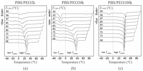 DSC cooling curves of poly(butylene succinate) (PBS)/poly(ethylene oxide) (PEO) 60/40 blends after the isothermal crystallization of the PBS component at different temperatures. Molecular weights of PEO are 2, 20 and 100 kg/mol in (a–c), respectively. The blends were first melted at 150 °C for 2 min and then cooled to Tc,PBS at 100 °C/min and held for sufficient time for the crystallization of the PBS component. The sample was then cooled to −50 °C at 10 °C/min to detect the crystallization of the PEO component [90,91]. Copyright 2013. Reproduced with permission from John Wiley & Sons.