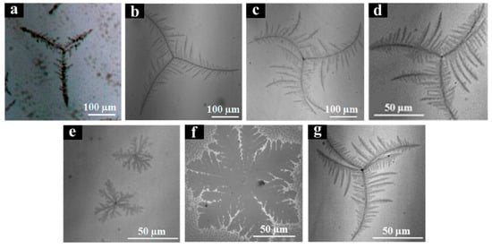 Optical micrographs of PLLA/poly(d-lactic acid) (PDLA) blended films (thickness ~20 nm) crystallized at 200 °C. The mass fractions of PLLA were: (a) 95%; (b) 90%; (c) 85.7%; (d) 75%; (e) 60%; (f) 50%; and (g) 25% [107]. Copyright 2010. Reproduced with permission from the American Chemical Society.