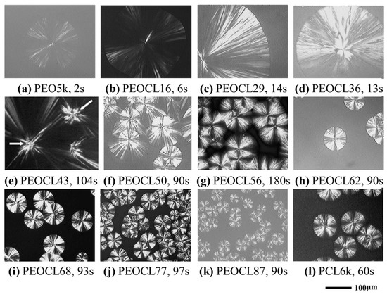 Jiang et al. [112] have studied the crystallization and morphology of PEO-b-PCL diblock copolymers. In these block copolymers, the two blocks have similar Tc and Tm; therefore, they can crystallize simultaneous under the same Tc. However, the crystallization rates of two blocks could be tuned by their weight fractions. PEO-b-PCL diblock copolymers formed the ring-banded spherulites, which were absent in the crystallization of PEO and PCL homopolymers. He et al. [114] have found that the PEO-b-PCL diblock copolymers with a PCL mass fraction of 50% formed a unique crystal morphology. At the beginning, many PCL spherulites were generated and grew slowly. PEO crystals were then nucleated on the PCL spherulites and grew rapidly to form as the outer portion of the concentric spherulites. They further studied the morphology of PEO-b-PCL diblock copolymers with different compositions [115], as shown in Figure 11. When the weight fraction of PCL block was 16–36% and 56–87%, only the spherulites of PEO and PCL were observed, respectively. Similarly, the PEO-b-PCL diblock copolymers with a PCL weight fraction of 43% and 50% formed the concentric spherulites. They proposed that the effect of PCL crystals on the nucleation of the PEO block might be negligible, because the crystal structures of PCL and PEO were different. PEO crystals might be nucleated on the same nuclei for PCL spherulites, leading to the formation of the unique concentric spherulites.