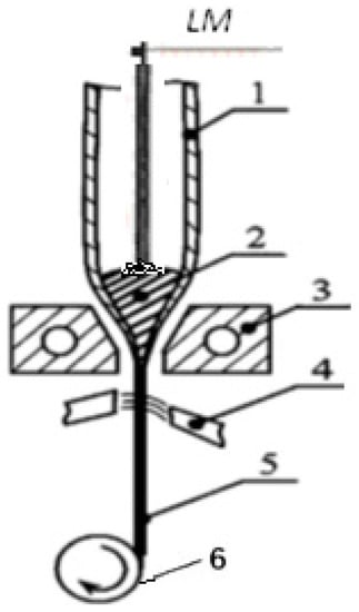 Technological aspects of the Taylor–Ulitovsky method for the production of the cast glass-coated microwires, which can have the different microstructure and composition of the metallic core, are presented below. If a continuous production process of casting glass-coated amorphous magnetic microwires is carried out, a metal alloy rod (named LM) is inserted into the glass tube 1.