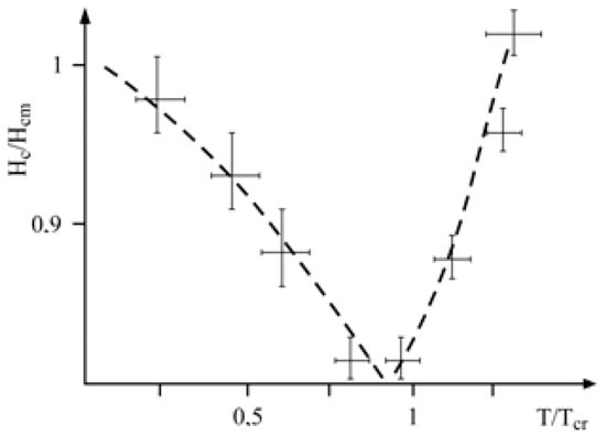 Dependence of coercivity, Hc/Hcm. (Hcm initial coercivity at room temperature), on annealing temperature, T/Tcr.