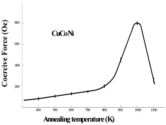 Dependence of coercivity (coercive field), Hc, on annealing temperature, Ta for CuCoNi-alloy [6,7].