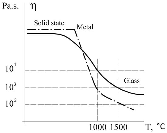 Special attention is paid to the parameters determining the casting and cooling rates that are responsible for the microstructure of the cast glass-coated microwires. So, the dynamical viscosity η is very important parameter whose value has characteristic temperature dependence. A typical temperature dependence of the dynamical viscosity is shown below in Figure 7. The temperature region where the casting process can be implemented is indicated by the dashed lines.