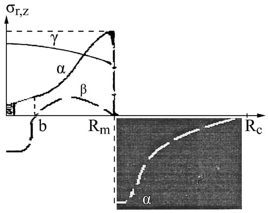 Qualitative pattern of the change of residual stresses σr,z along the microwire radius. Curve α presents the initial state of these stresses in the metal strand and in the glass (in glass it is shown by black color and dashed line). In the metal strand these stresses are always tensile, i.e., positive [5,8]. The residual stresses in the silicate glass always compress the glass envelope (i.e., they are negative). Inside the region of plastic relaxation there is shown a section (near the strand center) where the applicability of the continuum model is violated. Curve β is a hypothetic form of residual stresses in the metal strand after removal of the glass envelope or disruption of its bound with the metal strand. As an example, there are presented the qualitative results of the calculation of residual stresses according to [10] (curve γ) which are different from our data.