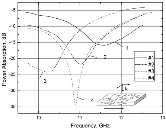 Absorption characteristics of shielding by a microwire composite (Fe69C5B16Si10) in a high-frequency field in the range of frequencies 10–12 GHz (see [9]): initial state of the screen is then turned by (2) 90°, (3) 180°, and (4) 270° about the perpendicular axis shown in the figure.