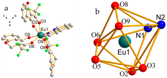 (a) Molecular structure of complex 1. (All hydrogen atoms have been omitted for clarity); (b) Coordination geometry of Eu3+ ion.