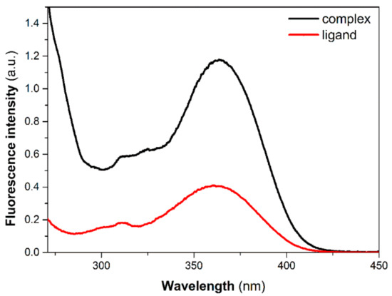 The ultraviolet-visible (UV-Vis) absorption spectra of the ligand 4-TFC and the complex Eu(4-TFC)3(phen) were measured in DMF solution at the concentration of 1 × 10−5 mol/L in the range of 200–450 nm at room temperature. Figure 2 shows that the maximum UV-Vis absorption for 4-TFC is at a wavelength of 360 nm, attributed to the singlet–singlet π-π* transition of the aromatic rings. Compared with the maximum absorption wavelength of 4-TFC, the maximum absorption wavelength of Eu(4-TFC)3(phen) is around 365 nm, in which the maximum absorption wavelength undergoes a red-shift from 360 nm to 365 nm, attributed to the perturbation of the Eu3+ ion. Meanwhile, with the maximum absorption band of 4-TFC and Eu(4-TFC)3(phen) at 360–365 nm, we can reasonably infer that the Eu3+ ion of the complex has almost no influence on the singlet excited state of the ligand. The absorption intensity of the complex is about three times as great as the ligand in the UV-Vis spectra at the concentration of 1 × 10−5 mol/L. This result agrees well with the presence of three ligands in each complex.