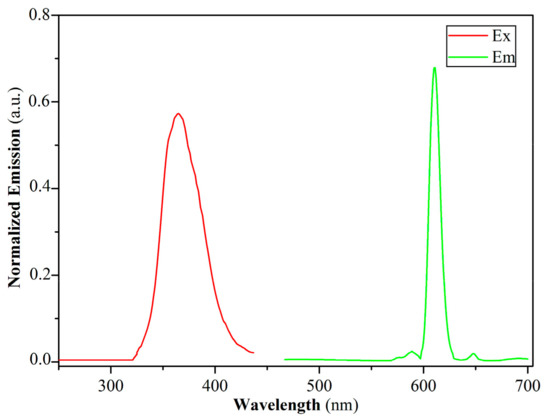 Figure 3 shows the excitation spectra and emission spectra of complex Eu(4-TFC)3(phen). The excitation wavelength at 360 nm is mainly attributed to the singlet–singlet π-π* electron transition of 4-TFC ligand. The emission spectra of complex Eu(4-TFC)3(phen) lying in the range of 550–700 nm coincide with the characteristic emission bands of the Eu3+ ions corresponding to the 5D0 → 7FJ (J = 0–4) transitions. Among these, the strongest emission is at λ = 612 nm for the electric dipole transition 5D0 → 7F2, and its corresponding intensity is very sensitive and easy to change as the coordination environment changes. This very intense 5D0 → 7F2 peak is responsible for the brilliant red emission of the complex, which indicates the presence of a single major chemical environment around the Eu3+ ion.