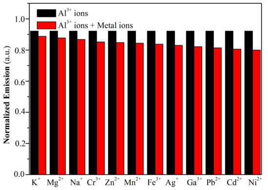 Fluorescence influence of various competing metal ions compared to Al3+ ions in DMF solution. The black bars represent only Al3+ ions in DMF (c = 1 × 10−2 mol/L). The red bars represent the fluorescence intensity after adding the corresponding competing metal ions.