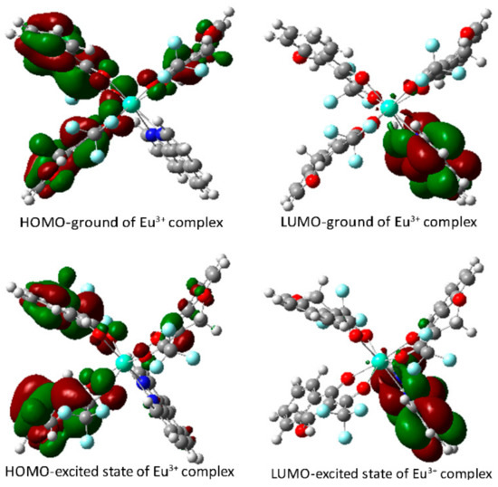 The results of the theoretical calculations for the absorption properties of the complexes are shown in Figure 9 and Figure S9 and Table 5. The HOMO and LUMO levels for the ground and singlet excited states of the Eu3+ complex were −0.21 eV and −0.08 eV, −0.31 eV and 0.05 eV, respectively. The electronic cloud distribution of HOMO in the ground and singlet excited states localizes at the three 4-TFC group, while that of LUMO localizes at 1,10-phenanthroline. As shown in Table 5, the lowest excitation energy of the Eu3+ complex calculated by TD-DFT is 3.14 eV. The absorption transition is mainly due to the ligand-to-metal charger transfer (LMCT), metal-to-ligand charger transfer (MLCT), and metal-centered (MC) transitions. Other high-energy absorption transitions are mainly due to the intraligand charge transfer (ILCT or π → π*), LMCT, MLCT, and MC transitions. In comparison with the absorption spectra of the Eu3+ complex, the lowest excitation energy of the Al3+ complex calculated by TD-DFT is 2.78 eV, which is mainly due to the ILCT, LMCT, and MLCT transitions. It is notable that the S9 high-energy absorption transitions are mainly due to LMCT and MLCT according to the selected frontier molecular orbits of the Al3+ complex, there is not ILCT transition in the absorption transitions (Figure S9).