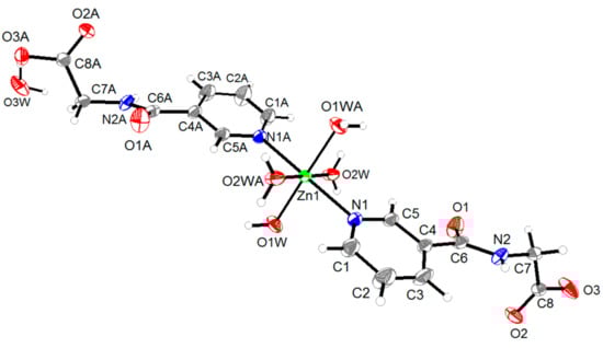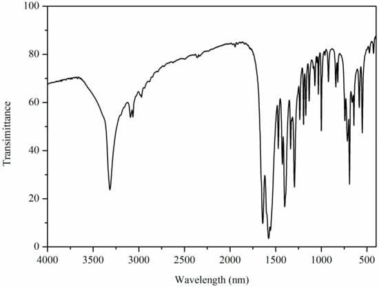 The IR spectrum of Zn(II) complex is shown in Figure 4. The characteristic absorption bands of Zn(II) complex appear at 3317 cm−1 (ν (N-H)), 1641 cm−1 (ν (C=O), 1577 cm−1, 1471 cm−1 (pyridine) and 1236 cm−1 (ν (C-N)). The corresponding absorption peaks of N-nicotinoylglycine appear at 3309, 1643, 1598, 1431, and 11,238 cm−1, respectively. It can be seen that only absorption peaks of pyridine changed, indicating that the N atom of pyridine takes part in coordination with Zn(II) ions [22]. The result of IR has been confirmed by single-crystal X-ray diffraction.