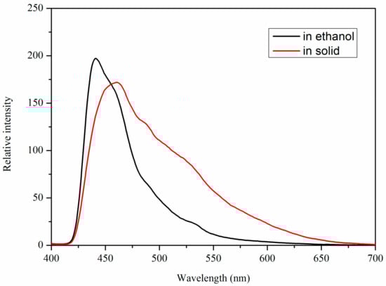 The fluorescent spectra of Zn(II) complex in solid and in ethanol. The excitation and emission slit widths were 5 nm.