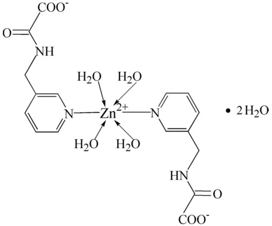 Nitrogen heterocyclic compounds have received much attention, because they have exhibited intriguing structures and potential practical applications in fluorescence [1,2,3,4,5], catalysis [6,7,8], electrochemistry [9], antitumor and antibacterial [10,11,12,13], gas adsorption [14], and chemical sensor [15,16]. Among ligands, nitrogen heterocyclic molecules and carboxylate ligands have been used widely to synthesize metal complexes because of their various coordination models [17,18,19,20]. Aiming to investigate the structure and fluorescent properties, a new Zn(II) complex, [ZnL2(H2O)4]·2H2O (1) (HL = N-nicotinoylglycine), has been synthesized by Zn(OAc)2·2H2O with N-nicotinoylglycine in 95% ethanol solution. Its structure has been determined by single-crystal X-ray diffraction, elemental analysis, and infrared spectrum. The fluorescent behaviors of Zn(II) complex in solid state and in ethanol solution have been investigated. The Zn(II) complex showed blue fluorescence both in solid state and in ethanol. The scheme depicting a chemical diagram of the Zn(II) complex is shown in Scheme 1.