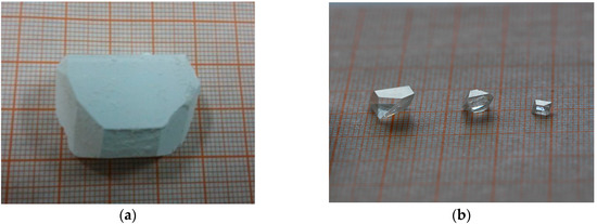 (a) Efflorescent TPPB crystal grown by the evaporation of mixed 3:2 solvents of dichloromethane and n-hexane. The crystal has sharp edges and well-defined crystal faces, which indicates an excellent quality before efflorescence; (b) TPPB crystal obtained by spontaneous nucleation and growth in water.