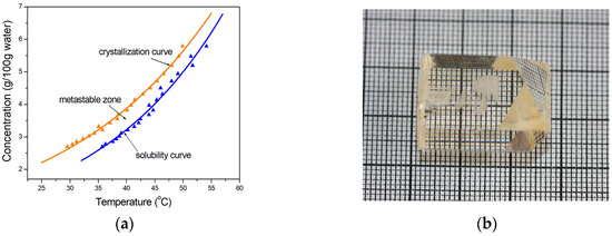 (a) TPPB solubility and crystallization curves in water. The triangles are the data measured. The solid curves are the fitted results based on the experimental data; (b) TPPB single-crystal with a size of 27 mm × 20 mm × 20 mm, grown by the temperature-lowering method.