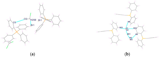 Short contacts between solvent and parent molecules in (a) TPPB (CH2Cl2); (b) TPPB (2H2O).