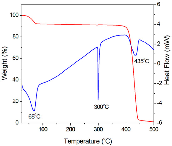 The thermal property of TPPB (2H2O) was studied. The thermogravimetry analysis (TGA) curve in Figure 4 shows that there is a weight loss of 8.8% at 68 °C, which is attributed to the loss of two water molecules as the temperature increases. In the differential scanning calorimetry (DSC) curve, the water loss corresponds to an endothermic process at 68 °C. The melting point of TPPB (2H2O) is 300 °C and the decomposition point is 435 °C. TPPB has a relative high decomposition temperature compared to general organic compounds.