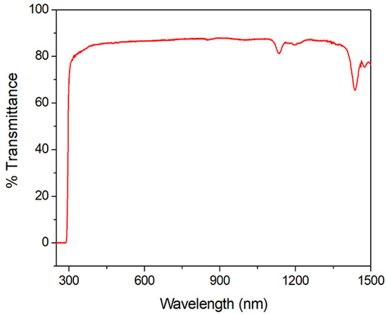 The optical transmission spectrum of the TPPB (2H2O) single-crystal with a thickness of 0.5 mm is shown in Figure 5. The crystal exhibits excellent transmission from 300 nm to 1350 nm. The weak peaks at 1136 nm and 1437 nm are attributed to the vibrational absorption of water molecules in the crystal lattice [18]. Anhydrous TPPB crystals are expected to decrease or even eliminate the absorption of water in the near-IR region.