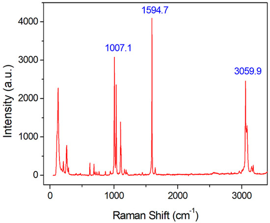 The Raman scattering spectrum of TPPB (2H2O) was measured by the excitation of a 473 nm laser using a confocal LabRAM HR800 Raman spectrometer (Figure 6). There are three strong peaks with Raman shifts over 1000 cm−1 at 3059.9 cm−1, 1594.7 cm−1, and 1007.1 cm−1, respectively. Since the C-H stretching vibrations in the single-substitutional benzene ring are dominant in vibration modes of TPPB, the peak located at 3059.9 cm−1 is strong [19]. The peak at 1594.7 cm−1 is attributed to the stretching vibration of the benzene ring. Also, the strong peak at 1007.1 cm−1 is the other Raman characteristic line of the single-substitutional benzene ring of TPPB. In this experiment, we also explored the Raman scattering spectra of a series of multiple-phenyl substituted compounds involving triphenylphosphine, triphenylphosphine oxide, triphenylphosphine sulfide, coordination compound of triphenylphosphine oxide, and sodium tetraphenylboron (see Supporting Information). We found that the main Raman shifts are similar in these compounds and in fact insusceptible to the number of the phenyl group, element in tetrahedron center, ligands, or the type of the crystal, e.g., molecular crystal or ionic crystal. Accordingly, and considering the high quality of the crystal and strong Raman scattering properties, TPPB (2H2O) crystal can be used as a potential material in Raman scattering-related nonlinear research and applications.