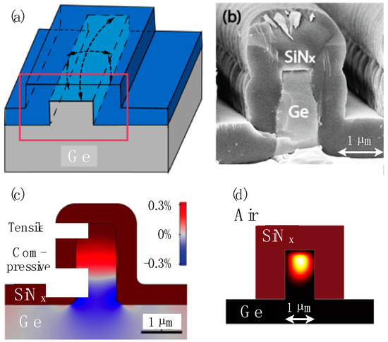 - Kuroyanagi, R.; Nguyen, L.M.; Tsuchizawa, T.; Ishikawa, Y.; Yamada, K.; Wada, K. Local bandgap control of germanium by silicon nitride stressor. Opt. Express 2013, 21, 18553–18557. [Google Scholar] [CrossRef] [PubMed]