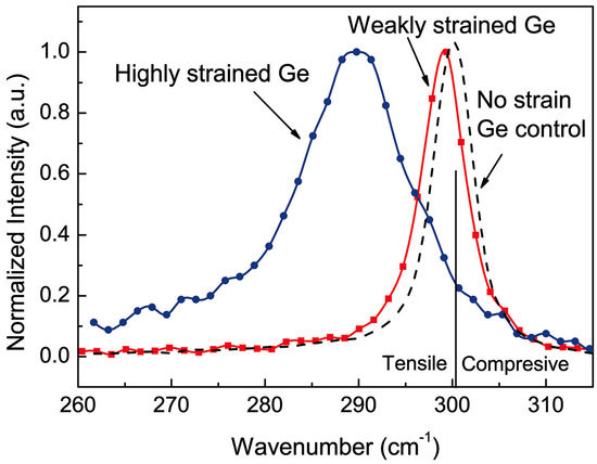 - Capellini, G.; Reich, C.; Guha, S.; Yamamoto, Y.; Lisker, M.; Virgilio, M.; Ghrib, A.; El Kurdi, M.; Boucaud, P.; Tillack, B.; et al. Tensile Ge microstructures for lasing fabricated by means of a silicon complementary metal-oxide-semiconductor process. Opt. Express 2014, 22, 399–410. [Google Scholar] [CrossRef] [PubMed]