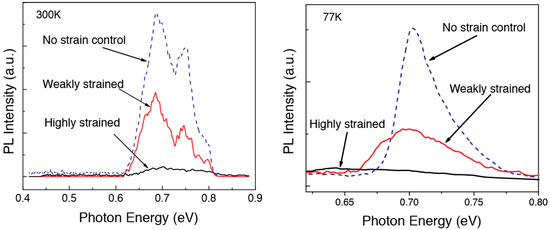 - Huo, Y.; Lin, H.; Chen, R.; Makarova, M.; Rong, Y.; Li, M.; Kamins, T.I.; Vuckovic, J.; Harris, J.S. Strong enhancement of direct transition photoluminescence with highly tensile-strained Ge grown by molecular beam epitaxy. Appl. Phys. Lett. 2011, 98, 011111. [Google Scholar] [CrossRef]
